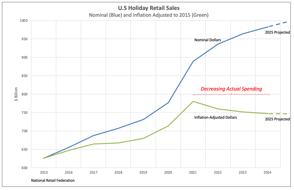 - ◆ Nominal holiday spending continues to rise, but real (inflation-adjusted) spending peaked in 2021 and has since flattened or declined.