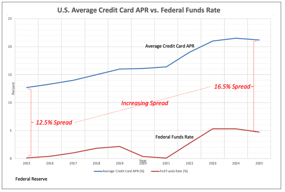 - ◆The spread between credit card APRs and the fed funds rate has widened from about 12.5% to over 16% making everday borrowing historically expensive.