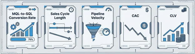 In a modern revenue engine, success is gauged by outcomes rather than activity. It’s crucial to move past vanity metrics like clicks, impressions, and lead volume toward Key Performance Indicators (KPIs) that directly correlate with revenue. These metrics offer a transparent, unbiased view of the overall health of the revenue engine, allowing leaders to identify issues, forecast accurately, and make confident, data-driven decisions.
