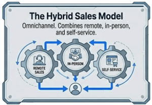 The Hybrid Sales Model is an omnichannel approach that smoothly combines remote selling, in-person interaction, and self-service options into a unified customer