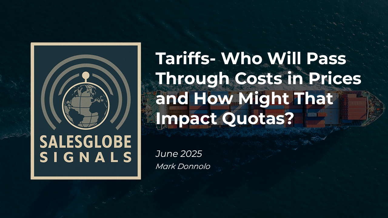 In this month’s Signals, Mark looks at how tariffs are beginning to ripple through the economy — raising unit cost expectations, prompting companies to reconsider pricing strategies, and influencing how sales leaders think about quotas. He explains that firms across goods and services sectors anticipate higher costs from tariffs and will pass varying portions of those costs on to customers through price increases, with larger companies and retailers leading the way.